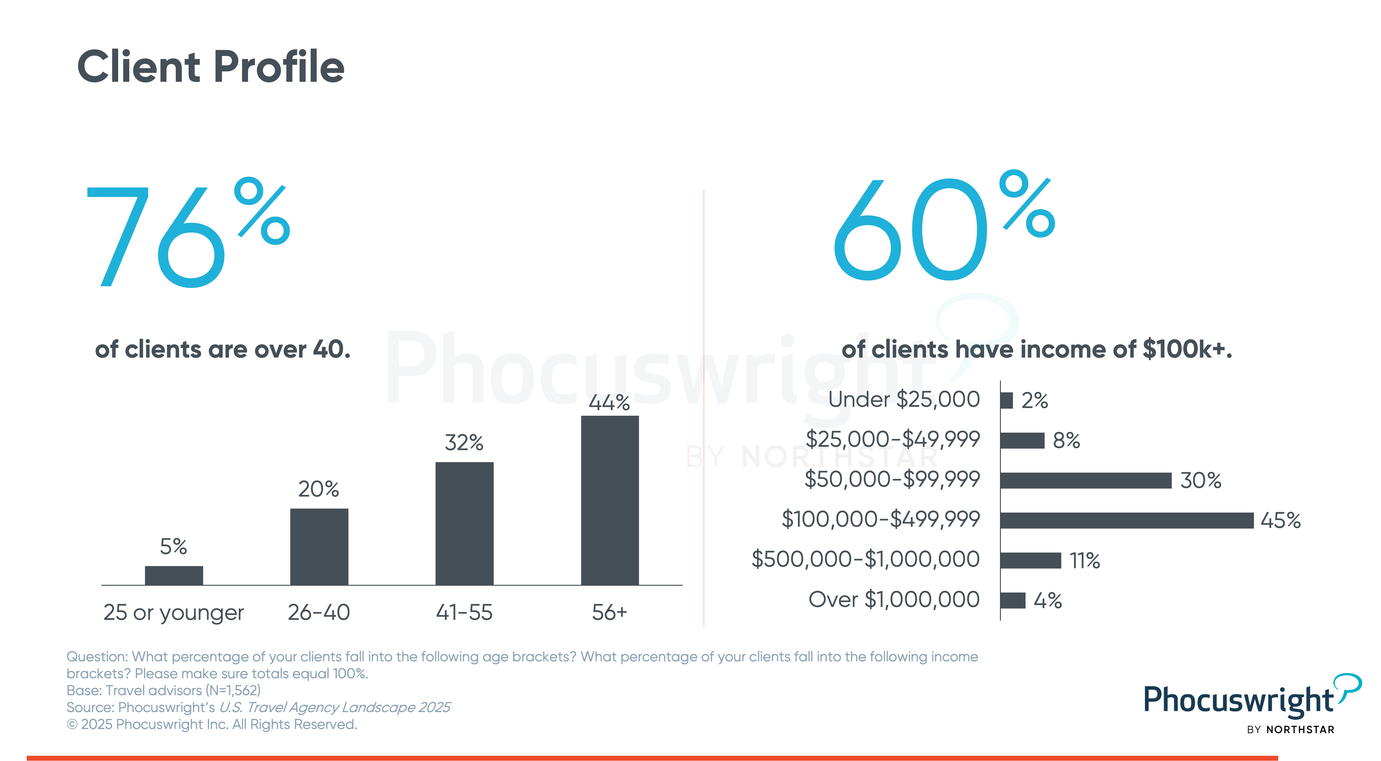 Travelers who work with advisors are typically older and wealthier than the average traveler. More than three quarters of clients are over 40 years old, with 44% older than 55. Six in 10 clients have an annual income of $100,000 or more.